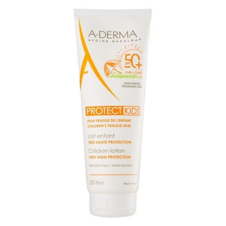 Aderma A-D Protect Latte Kids 50+ 250 ml, latte abbronzante protettivo per bambini SPF 50+, protezione molto alta ideale per i più piccoli