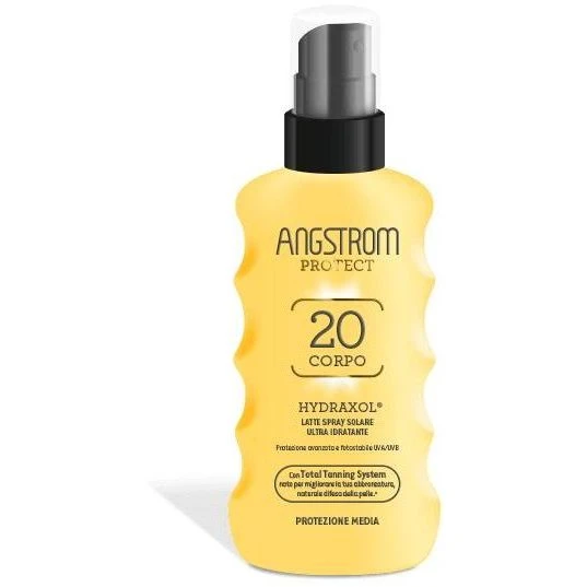 Angstrom Protect SPF20 Corpo Hydraxol latte spray solare :Contiene filtri solari UVA/UVB avanzati, fotostabili, ad ampio spettro per un’immediata protezione dai raggi solari nocivi.Questa formula ultra-leggera può essere spruzzata da tutte le angolazioni per una facile applicazione. La texture non grassa si assorbe rapidamente senza lasciare residui visibili.Grazie al Triple Moist Complex ha un’azione idratante immediata, intensa e di lunga durata. * La sua formulazione è arricchita con Total Tanning System noto per migliorare e prolungare la naturale abbronzatura stimolando la produzione di melanina ed aumentando così le naturali difese della pelle dal sole.Molto resistente all’acqua.Indicato per pelli sensibili.Lievemente profumato.Dermatologicamente testato.