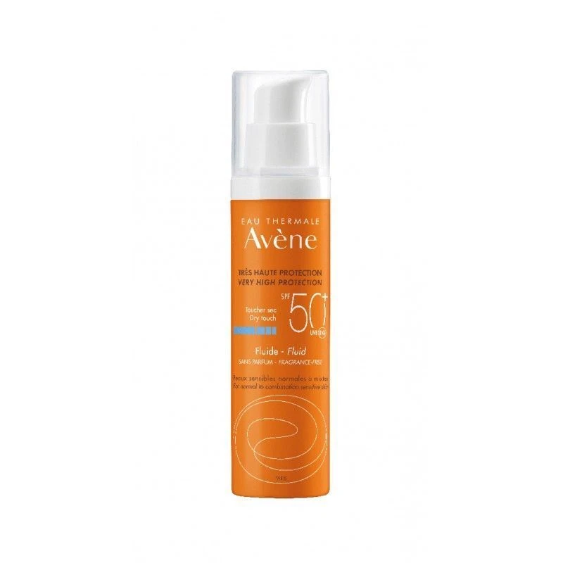Avene Fluido Solare SPF50+ : Fluido senza profumo SPF50+ per viso e collo resistente all’acqua. Indicazioni: Protezione solare molto alta della pelle sensibile, ipersensibile al sole o esposta ad un irraggiamento intenso. Proprietà: Il fluido 50+ senza profumo assicura una protezione ottimale contro i raggi UVB e UVA grazie all’associazione esclusiva Sunsitive protection. Ricco in acqua termale Avène ed in polveri opacizzanti la sua consistenza leggera offre alla pelle un effetto non lucido.