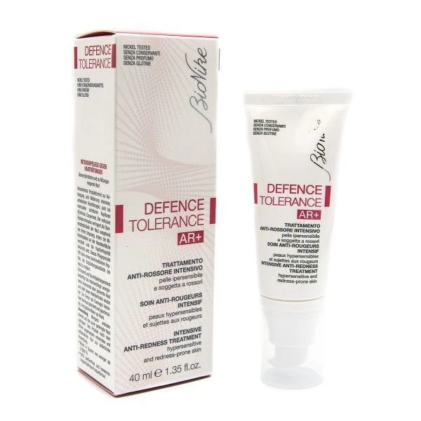 BIONIKE DEFENCE TOLERANCE AR+ TRATTAMENTO ANTI-ROSSORE 40ML-Formula idratante e protettiva che previene e attenua i rossori cutanei intensi e persistenti, ripristina il benessere cutaneo e allevia le sensazioni di calore e pizzicore. Dalla texture gel-crema, lascia la pelle morbida e lenita. Costituisce un’ottima base per il trucco.