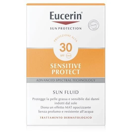 Eucerin Sun Fluid Opacizzante SPF30 : Un fluido solare per il viso che combina una protezione UV alta con la protezione cellulare e del DNA.Questo fluido opacizzante non grasso è ideale per la pelle mista o grassa. Eucerin Sun Fluid Opacizzante FP 30 è uno schermo solare avanzato per il viso specificamente sviluppato per proteggere dai danni dei raggi UV. Per la pelle mista o grassa. Resistente all’acqua. Questa formula innovativa garantisce una protezione intensa dai danni causati dai raggi UV – sia negli strati superiori che in quelli inferiori della pelle:Un sistema di filtri fotostabili UVA/UVB altamente efficace con Tinosorb S che fornisce una protezione sicura dalle scottature. Conforme alla normativa EU e delle Aziende Cosmetiche Europee – L’Associazione Personal Care (prima chiamata Colipa).Acido Glicirretico che protegge il DNA favorendo la protezione naturale del DNA ed i meccanismi di riparazione.Protezione cellulare con Licocalcone A – un potente antiossidante che protegge le cellule cutanee dai danni causati dai radicali liberi.Questa texture ultra leggera, non grassa opacizza la pelle e non lascia l’effetto di lucido. Agisce bene nei climi caldi ed umidi.