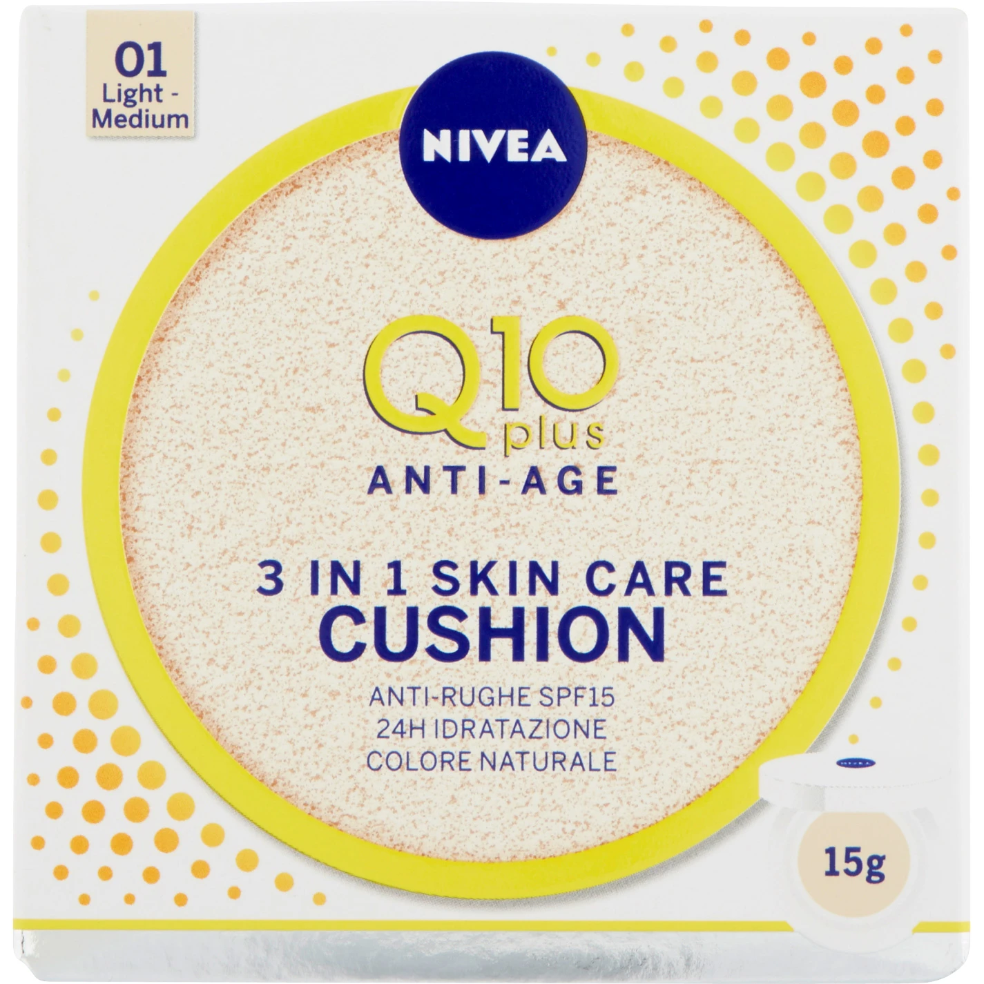 NIvea Q10 plus Anti-Age 3 in 1 Skin Care Cushion – 01 Light Medium – Vuoi perfezionare la pelle del tuo viso garantendole anche idratazione e luminosità? Facile, con l’innovativo 3 in 1 Skin Care Cushion con SPF15 doni al tuo viso la luminosità di una pelle naturalmente bella, con un finish naturale: 1. La sua formula innovativa arricchita con coenzima Q10, naturalmente presente nella pelle giovane, rallenta gli effetti del tempo. 2. Dona alla pelle 24h di idratazione e ad ogni ritocco lascia la pelle fresca, morbida e liscia. 3. I pigmenti colorati coprenti si adattano facilmente all’incarnato per svelare la radiosità di una pelle giovane. Un’applicazione facile e veloce per rinfrescare il look e prenderti cura della tua pelle, sempre e ovunque. Risultati sulla pelle: Immediati: il viso appare fresco, liscio e con un colorito uniforme. A lungo termine: il viso appare sempre più liscio, le rughe e le linee sottili sono visibilmente ridotte