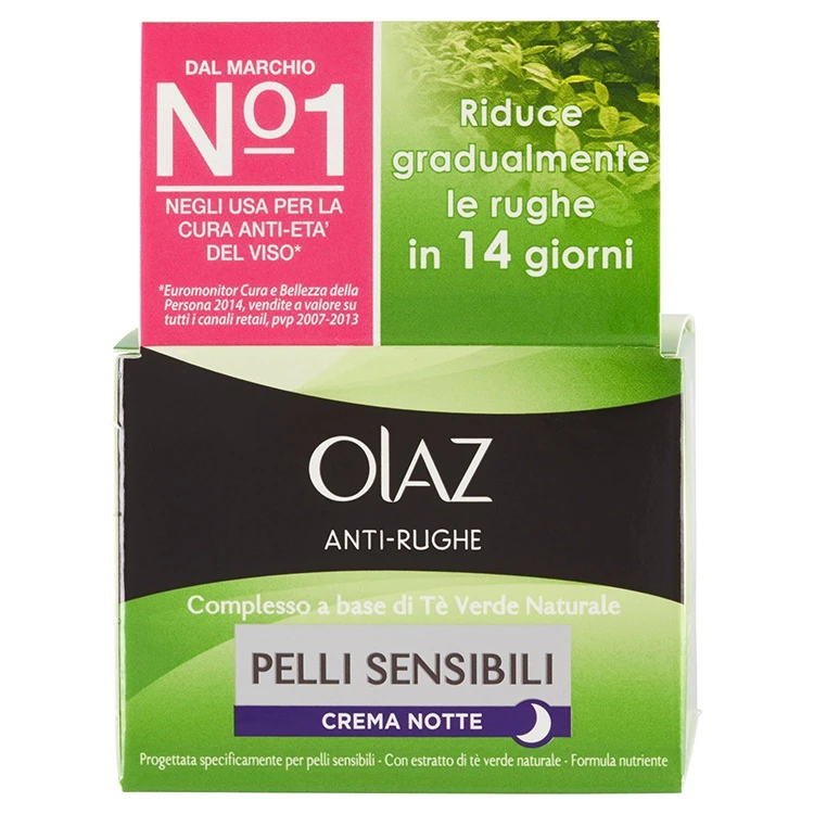 Olaz anti-rughe crema notte per pelli sensibili unisce una crema anti-rughe, che aiuta a ridurre la visibilita delle rughe e delle linee sottili, in una formula che si prende cura della tua pelle sensibile mentre dormi. ogni sera applica delicatamente su viso e collo e al tuo risveglio ti vedrai sempre al meglio, giorno dopo giorno. completa la cura serale della tua pelle con olaz anti-rughe crema giorno per pelli sensibili