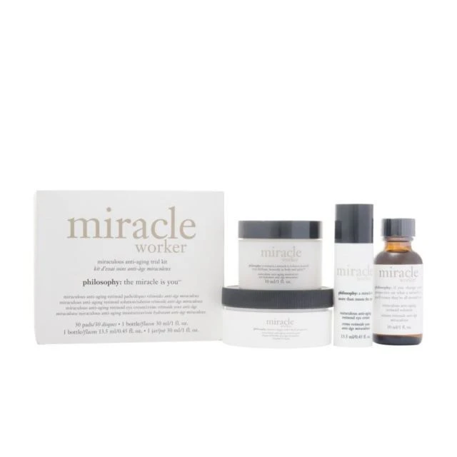 Philosophy Miracle Worker Confezione Regalo Trial Kit Miracoloso Anti-Età – 30 ml Idratante + 30 ml Soluzione ai Retinoidi + 30 Pads ai Retinoidi + 13.5 ml Crema Occhi ai Retinoidi.