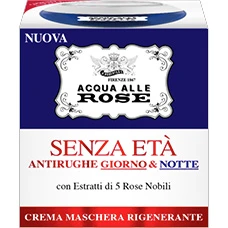 ROBERTS Acqua alle Rose – SENZA ETA’ – CREMA MASCHERA ANTIRUGHE GIORNO&NOTTE: Tutto il potere di 5 Rose nobili per una doppia azione antietà: crema levigante di giorno e maschera rigenerante di notte. Doppia azione per una pelle senza età: utilizzata come crema di giorno ha un effetto levigante sulle rughe, utilizzata come maschera di notte favorisce il rilascio di principi attivi idratanti per un effetto rigenerante globale.