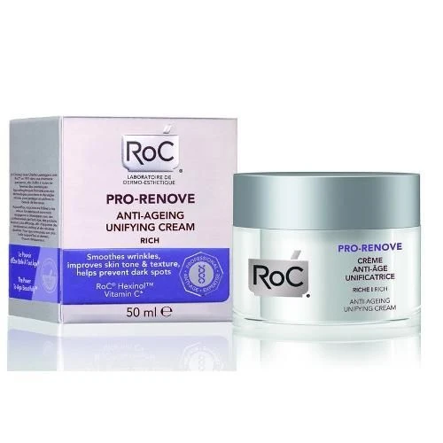 Roc Pro renove crema ricca antietà uniformante SPF15 -Crema ricca multiazione. In un solo gesto cosmetico idrata e leviga le rughe di espressione, migliora il tono e la trama cutanea, aiuta a ridurre le macchie brune.