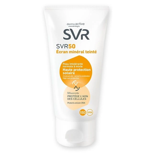 dermoactive cosmétologie SVR SVR50 Écran minéral teinté Protezione solare alta UVA e UVB. Schermo 100% minerale. Color carne. Non comedogena. Senza parabeni. Resiste ad acqua e sudore. Testato sotto controllo dermatologico. Modalità d’utilizzo Prima di esporsi al sole, applicare una dose sufficiente su tutto il viso, il collo e il decolleté. Diminuire la quantità diminuisce l’efficacia della protezione. Rinnovare l’applicazione frequentemente, soprattutto dopo aver sudato, nuotato o essersi asciugati. Formato Flacone dispenser da 40 ml