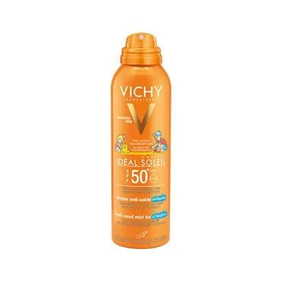 Vichy Idéal Soleil SPF50 : Spray solare che impedisce alla sabbia di attaccarsi alla pelle. Protezione molto alta. Resistente all’acqua.Per pelle sensibile / Per Bambini